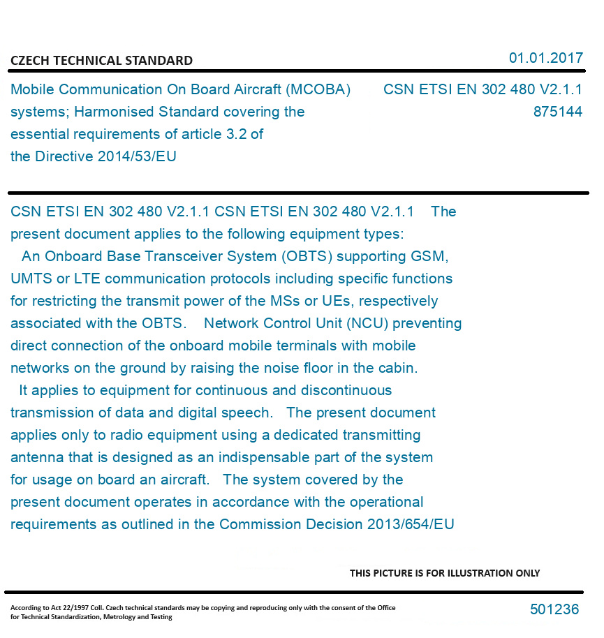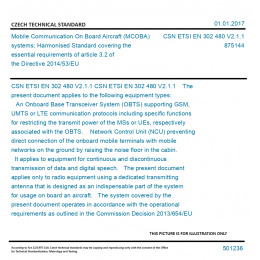 CSN ETSI EN 302 480 V2.1.1 The present document applies to the following equipment types: An Onboard Base Transceiver System (OBTS) supporting GSM, UMTS or LTE communication protocols including specific functions for restricting the transmit power of the MSs or UEs, respectively associated with the OBTS. Network Control Unit (NCU) preventing direct connection of the onboard mobile terminals with mobile networks on the ground by raising the noise floor in the cabin. It applies to equipment for continuous and discontinuous transmission of data and digital speech. The present document applies only to radio equipment using a dedicated transmitting antenna that is designed as an indispensable part of the system for usage on board an aircraft. The system covered by the present document operates in accordance with the operational requirements as outlined in the Commission Decision 2013/654/EU [i.3]. The present document contain requirements to demonstrate that Radio equipment both effectively uses and supports the efficient use of radio spectrum in order to avoid harmful interference. In addition to the present document, other ENs that specifie technical requirements in respect of essential requirements under other parts of Article 3 of the Radio Equipment Directive may apply to equipment within the scope of the present document. NOTE: A list of such ENs is included on the web site http://www.newapproach.org. The present document does not cover equipment compliance with relevant civil aviation regulations. In this respect, a MCOBA system, for its installation and operation on board an aircraft is subject to additional national or international civil aviation airworthiness certification requirements, for example to EUROCAE ED-14E [i.6]. Original English text of CSN EN Standard. The price of the Standard included all amendments and correcturs.