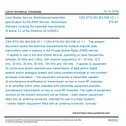 CSN ETSI EN 303 039 V2.1.1 The present document covers the technical requirements for multiple channel radio transmitters used in stations in the Private Mobile Radio (PMR) service. It applies to use in the land mobile service, operating on radio frequencies between 30 MHz and 3 GHz, with channel separations of < 10 kHz, 12,5 kHz, 20 kHz, 25 kHz, 50 kHz, 100 kHz and 150 kHz. It applies to equipment for continuous and/or discontinuous transmission of data and/or digital speech and/or analogue speech and using constant envelope or non-constant envelope modulation. The equipment comprises a transmitter capable of simultaneous amplification or transmission on two or more RF channels, or an amplifier which when operated with transmitter equipment provides simultaneous transmission on two or more RF channels. The types of equipment covered by the present document are as follows: - base station (equipment fitted with an antenna connector, intended for use in a fixed location); - mobile station (equipment fitted with an antenna connector, normally used in a vehicle or as a transportable); - those hand portable stations: a) fitted with an antenna connector; or b) without an external antenna connector (integral antenna equipment), but fitted with a permanent internal or a temporary internal 50 Ohm Radio Frequency (RF) connector which allows access to the transmitter output; and - any equipment that may be used in combination with any of the above equipments when directly connected to those equipments for the amplification of the transmitter output signals of two or more individual equipments. Types of equipment not covered by the present document are as follows: - hand portable equipment without an external or internal RF connector and without the possibility of having a temporary internal 50 Ohm RF connector is not covered by the present document; - any equipment using passive combining solutions where each transmitter connected to the passive combining system transmits on a single channel, as detailed in ETSI EG 200 053 [i.2], clause H.3. These specifications apply to the transmitter or transmitter amplifier only. If a receiver is fitted to the same equipment, the receiver specifications in the relevant specification (references [i.5] to [i.12]) also apply. These specifications do not necessarily include all the characteristics that may be required by a user of equipment, nor do they necessarily represent the optimum performance achievable. In addition to the present document, other ENs that specify technical requirements in respect of essential requirements under other parts of article 3 of the Radio Equipment Directive [i.3] may apply to equipment within the scope of the present document. Original English text of CSN EN Standard. The price of the Standard included all amendments and correcturs.