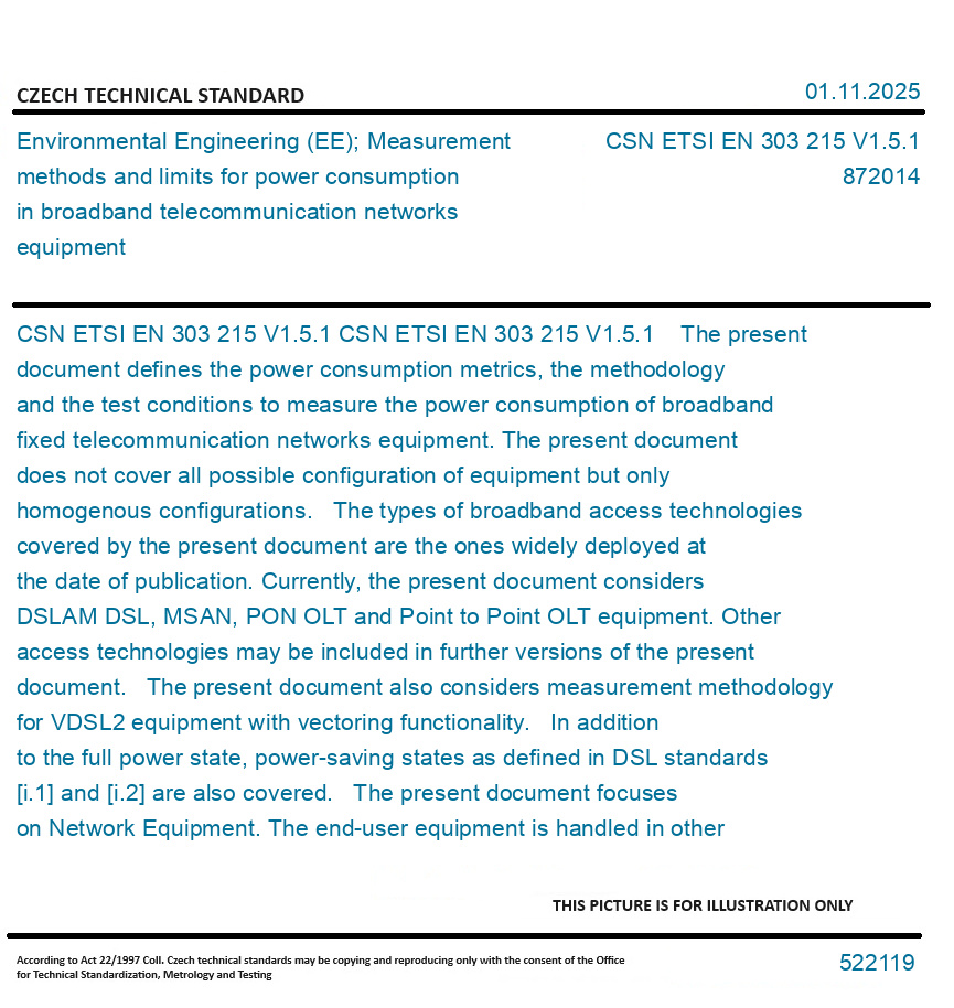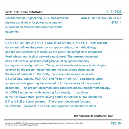 CSN ETSI EN 303 215 V1.5.1 The present document defines the power consumption metrics, the methodology and the test conditions to measure the power consumption of broadband fixed telecommunication networks equipment. The present document does not cover all possible configuration of equipment but only homogenous configurations. The types of broadband access technologies covered by the present document are the ones widely deployed at the date of publication. Currently, the present document considers DSLAM DSL, MSAN, PON OLT and Point to Point OLT equipment. Other access technologies may be included in further versions of the present document. The present document also considers measurement methodology for VDSL2 equipment with vectoring functionality. In addition to the full power state, power-saving states as defined in DSL standards [i.1] and [i.2] are also covered. The present document focuses on Network Equipment. The end-user equipment is handled in other documents, see ETSI EN 301 575 [i.6] for CPE [i.6] and ETSI EN 303 423 [i.9] for network standby. Original English text of CSN EN Standard. The price of the Standard included all amendments and correcturs.