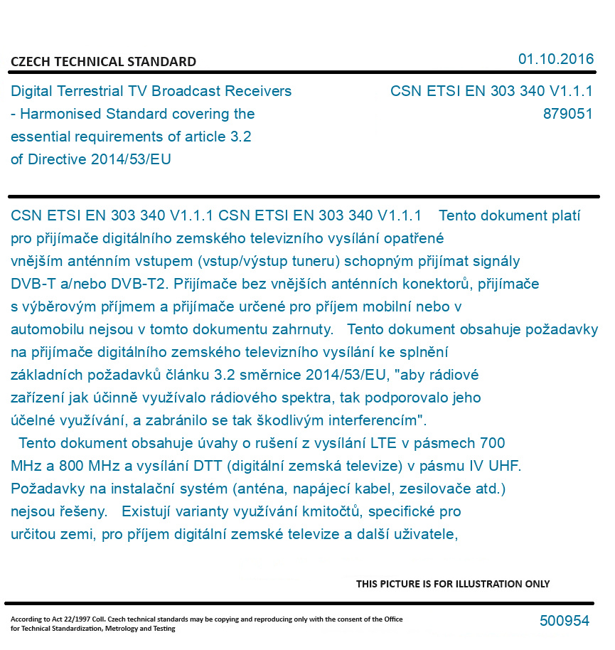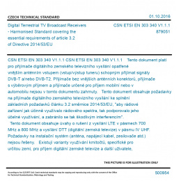 CSN ETSI EN 303 340 V1.1.1 Tento dokument platí pro přijímače digitálního zemského televizního vysílání opatřené vnějším anténním vstupem (vstup/výstup tuneru) schopným přijímat signály DVB-T a/nebo DVB-T2. Přijímače bez vnějších anténních konektorů, přijímače s výběrovým příjmem a přijímače určené pro příjem mobilní nebo v automobilu nejsou v tomto dokumentu zahrnuty. Tento dokument obsahuje požadavky na přijímače digitálního zemského televizního vysílání ke splnění základních požadavků článku 3.2 směrnice 2014/53/EU, "aby rádiové zařízení jak účinně využívalo rádiového spektra, tak podporovalo jeho účelné využívání, a zabránilo se tak škodlivým interferencím". Tento dokument obsahuje úvahy o rušení z vysílání LTE v pásmech 700 MHz a 800 MHz a vysílání DTT (digitální zemská televize) v pásmu IV UHF. Požadavky na instalační systém (anténa, napájecí kabel, zesilovače atd.) nejsou řešeny. Existují varianty využívání kmitočtů, specifické pro určitou zemi, pro příjem digitální zemské televize a další uživatele, jako jsou například mobilní širokopásmové aplikace. Zkoušky v tomto dokumentu platí pouze tehdy, pokud přijímač vysílání DTT podporuje konfiguraci požadovaného signálu používanou při dotčené zkoušce. Použitelné zkoušky jsou souhrnně uvedeny v příloze E, tabulka E.1. Original English text of CSN EN Standard. The price of the Standard included all amendments and correcturs.