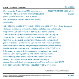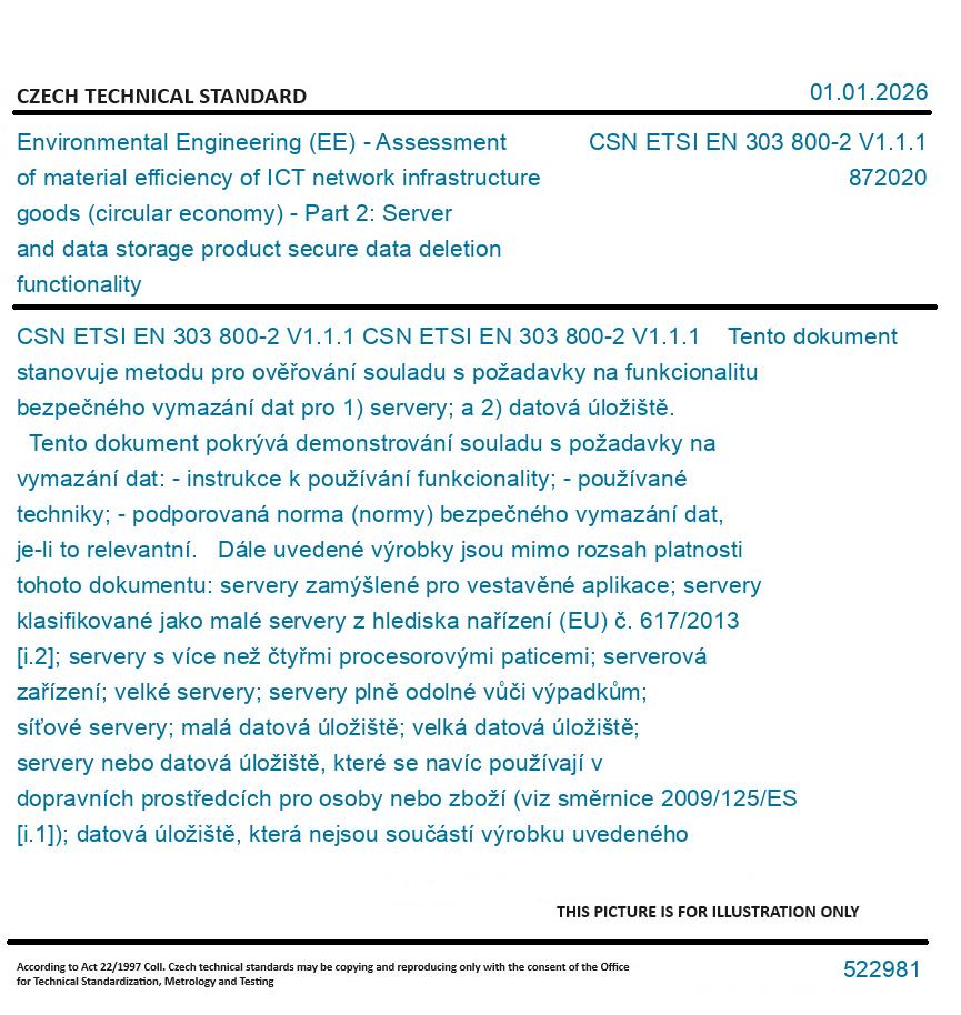 CSN ETSI EN 303 800-2 V1.1.1 Tento dokument stanovuje metodu pro ověřování souladu s požadavky na funkcionalitu bezpečného vymazání dat pro 1) servery; a 2) datová úložiště. Tento dokument pokrývá demonstrování souladu s požadavky na vymazání dat: - instrukce k používání funkcionality; - používané techniky; - podporovaná norma (normy) bezpečného vymazání dat, je-li to relevantní. Dále uvedené výrobky jsou mimo rozsah platnosti tohoto dokumentu: servery zamýšlené pro vestavěné aplikace; servery klasifikované jako malé servery z hlediska nařízení (EU) č. 617/2013 [i.2]; servery s více než čtyřmi procesorovými paticemi; serverová zařízení; velké servery; servery plně odolné vůči výpadkům; síťové servery; malá datová úložiště; velká datová úložiště; servery nebo datová úložiště, které se navíc používají v dopravních prostředcích pro osoby nebo zboží (viz směrnice 2009/125/ES [i.1]); datová úložiště, která nejsou součástí výrobku uvedeného na trh výrobcem, jeho zplnomocněnými zástupci nebo dovozcem a nejsou zahrnuta v úpravách nebo aktualizacích poskytnutých nebo specifikovaných výrobcem, jeho zplnomocněnými zástupci nebo dovozcem.