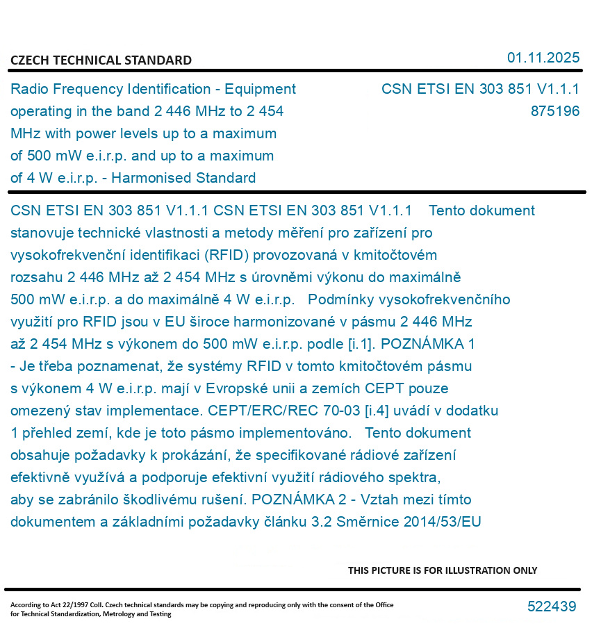 CSN ETSI EN 303 851 V1.1.1 Tento dokument stanovuje technické vlastnosti a metody měření pro zařízení pro vysokofrekvenční identifikaci (RFID) provozovaná v kmitočtovém rozsahu 2 446 MHz až 2 454 MHz s úrovněmi výkonu do maximálně 500 mW e.i.r.p. a do maximálně 4 W e.i.r.p. Podmínky vysokofrekvenčního využití pro RFID jsou v EU široce harmonizované v pásmu 2 446 MHz až 2 454 MHz s výkonem do 500 mW e.i.r.p. podle [i.1]. POZNÁMKA 1 - Je třeba poznamenat, že systémy RFID v tomto kmitočtovém pásmu s výkonem 4 W e.i.r.p. mají v Evropské unii a zemích CEPT pouze omezený stav implementace. CEPT/ERC/REC 70-03 [i.4] uvádí v dodatku 1 přehled zemí, kde je toto pásmo implementováno. Tento dokument obsahuje požadavky k prokázání, že specifikované rádiové zařízení efektivně využívá a podporuje efektivní využití rádiového spektra, aby se zabránilo škodlivému rušení. POZNÁMKA 2 - Vztah mezi tímto dokumentem a základními požadavky článku 3.2 Směrnice 2014/53/EU [i.7] je uveden v příloze A. Original English text of CSN EN Standard. The price of the Standard included all amendments and correcturs.