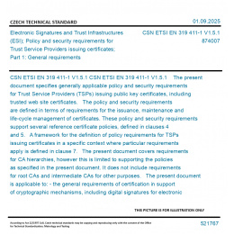 CSN ETSI EN 319 411-1 V1.5.1 The present document specifies generally applicable policy and security requirements for Trust Service Providers (TSPs) issuing public key certificates, including trusted web site certificates. The policy and security requirements are defined in terms of requirements for the issuance, maintenance and life-cycle management of certificates. These policy and security requirements support several reference certificate policies, defined in clauses 4 and 5. A framework for the definition of policy requirements for TSPs issuing certificates in a specific context where particular requirements apply is defined in clause 7. The present document covers requirements for CA hierarchies, however this is limited to supporting the policies as specified in the present document. It does not include requirements for root CAs and intermediate CAs for other purposes. The present document is applicable to: - the general requirements of certification in support of cryptographic mechanisms, including digital signatures for electronic signatures and seals; - the general requirements of certification authorities issuing TLS/SSL certificates; - the general requirements of the use of cryptography for authentication and encryption. The present document does not specify how the requirements identified can be assessed by an independent party, including requirements for information to be made available to such independent assessors, or requirements on such assessors. NOTE - See ETSI EN 319 403 [i.2] for guidance on assessment of TSP's processes and services. The present document references ETSI EN 319 401 [9] for general policy requirements common to all classes of TSP's services. The present document includes provisions consistent with the requirements from the CA/Browser Forum in EVCG [4] and BRG [6]. Original English text of CSN EN Standard. The price of the Standard included all amendments and correcturs.