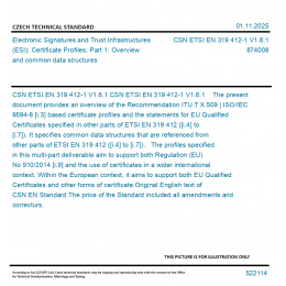 CSN ETSI EN 319 412-1 V1.6.1 The present document provides an overview of the Recommendation ITU T X.509 | ISO/IEC 9594-8 [i.3] based certificate profiles and the statements for EU Qualified Certificates specified in other parts of ETSI EN 319 412 ([i.4] to [i.7]). It specifies common data structures that are referenced from other parts of ETSI EN 319 412 ([i.4] to [i.7]). The profiles specified in this multi-part deliverable aim to support both Regulation (EU) No 910/2014 [i.9] and the use of certificates in a wider international context. Within the European context, it aims to support both EU Qualified Certificates and other forms of certificate. Original English text of CSN EN Standard. The price of the Standard included all amendments and correcturs.