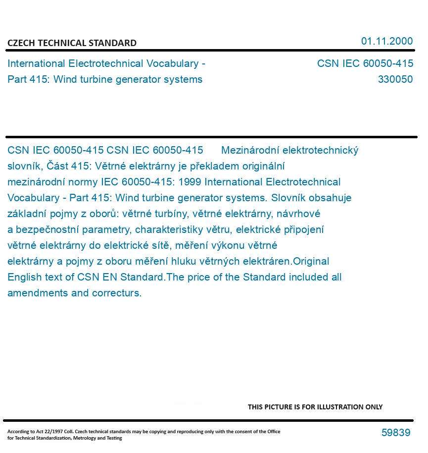 CSN IEC 60050-415 Mezinárodní elektrotechnický slovník, Část 415: Větrné elektrárny je překladem originální mezinárodní normy IEC 60050-415: 1999 International Electrotechnical Vocabulary - Part 415: Wind turbine generator systems. Slovník obsahuje základní pojmy z oborů: větrné turbíny, větrné elektrárny, návrhové a bezpečnostní parametry, charakteristiky větru, elektrické připojení větrné elektrárny do elektrické sítě, měření výkonu větrné elektrárny a pojmy z oboru měření hluku větrných elektráren. Original English text of CSN EN Standard. The price of the Standard included all amendments and correcturs.
