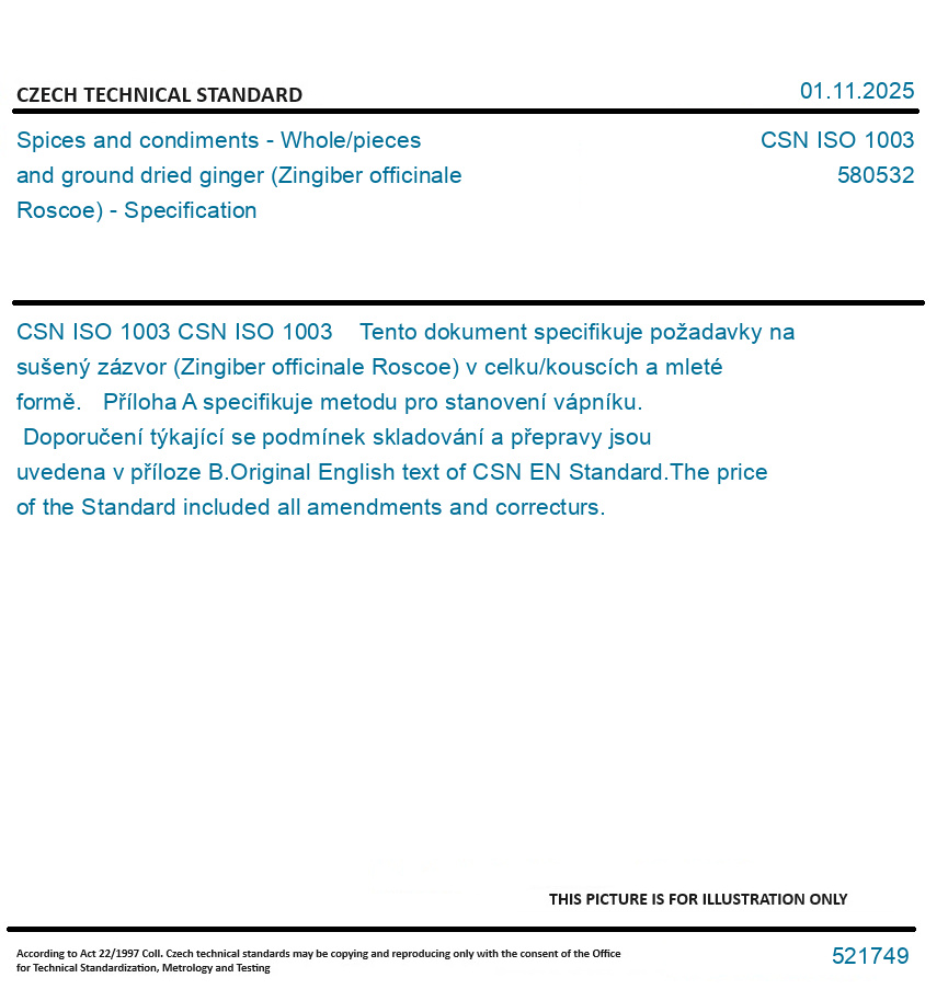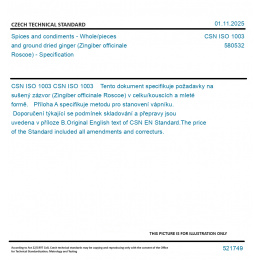 CSN ISO 1003 Tento dokument specifikuje požadavky na sušený zázvor (Zingiber officinale Roscoe) v celku/kouscích a mleté formě. Příloha A specifikuje metodu pro stanovení vápníku. Doporučení týkající se podmínek skladování a přepravy jsou uvedena v příloze B. Original English text of CSN EN Standard. The price of the Standard included all amendments and correcturs.