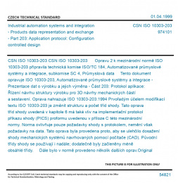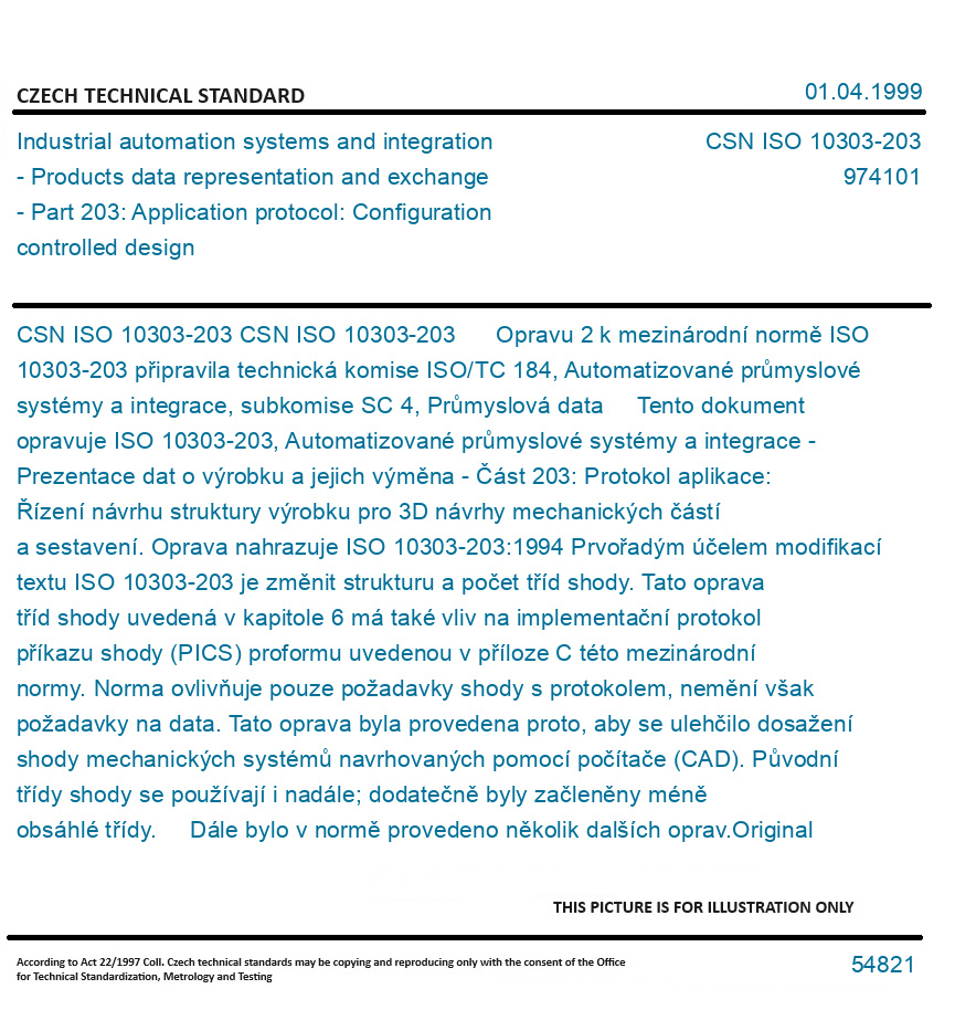 CSN ISO 10303-203 Opravu 2 k mezinárodní normě ISO 10303-203 připravila technická komise ISO/TC 184, Automatizované průmyslové systémy a integrace, subkomise SC 4, Průmyslová data Tento dokument opravuje ISO 10303-203, Automatizované průmyslové systémy a integrace - Prezentace dat o výrobku a jejich výměna - Část 203: Protokol aplikace: Řízení návrhu struktury výrobku pro 3D návrhy mechanických částí a sestavení. Oprava nahrazuje ISO 10303-203:1994 Prvořadým účelem modifikací textu ISO 10303-203 je změnit strukturu a počet tříd shody. Tato oprava tříd shody uvedená v kapitole 6 má také vliv na implementační protokol příkazu shody (PICS) proformu uvedenou v příloze C této mezinárodní normy. Norma ovlivňuje pouze požadavky shody s protokolem, nemění však požadavky na data. Tato oprava byla provedena proto, aby se ulehčilo dosažení shody mechanických systémů navrhovaných pomocí počítače (CAD). Původní třídy shody se používají i nadále; dodatečně byly začleněny méně obsáhlé třídy. Dále bylo v normě provedeno několik dalších oprav.