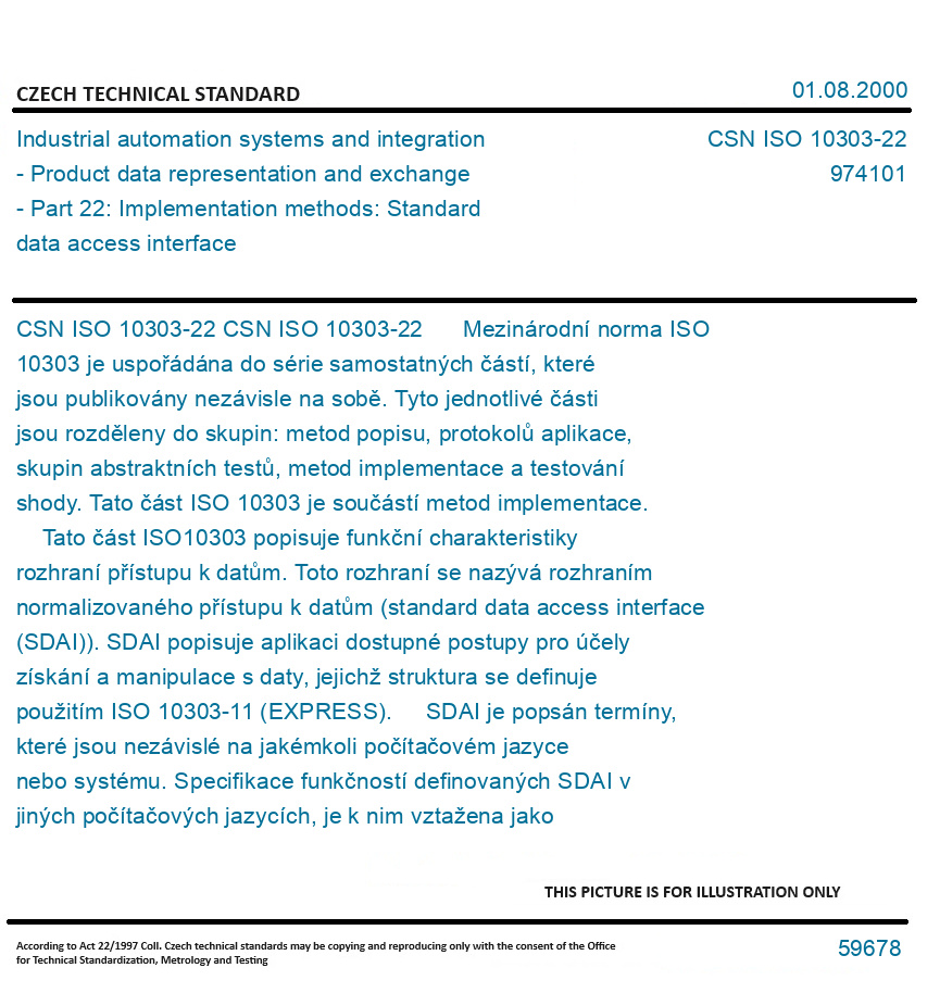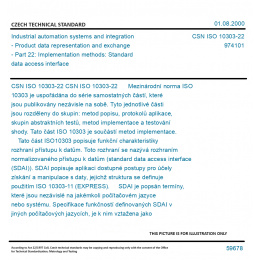 CSN ISO 10303-22 Mezinárodní norma ISO 10303 je uspořádána do série samostatných částí, které jsou publikovány nezávisle na sobě. Tyto jednotlivé části jsou rozděleny do skupin: metod popisu, protokolů aplikace, skupin abstraktních testů, metod implementace a testování shody. Tato část ISO 10303 je součástí metod implementace. Tato část ISO10303 popisuje funkční charakteristiky rozhraní přístupu k datům. Toto rozhraní se nazývá rozhraním normalizovaného přístupu k datům (standard data access interface (SDAI)). SDAI popisuje aplikaci dostupné postupy pro účely získání a manipulace s daty, jejichž struktura se definuje použitím ISO 10303-11 (EXPRESS). SDAI je popsán termíny, které jsou nezávislé na jakémkoli počítačovém jazyce nebo systému. Specifikace funkčností definovaných SDAI v jiných počítačových jazycích, je k nim vztažena jako jazyková vazba SDAI. Jazykové vazby SDAI jsou specifikovány jako doprovodné dokumenty v rámci série metod implementace ISO 10303.
