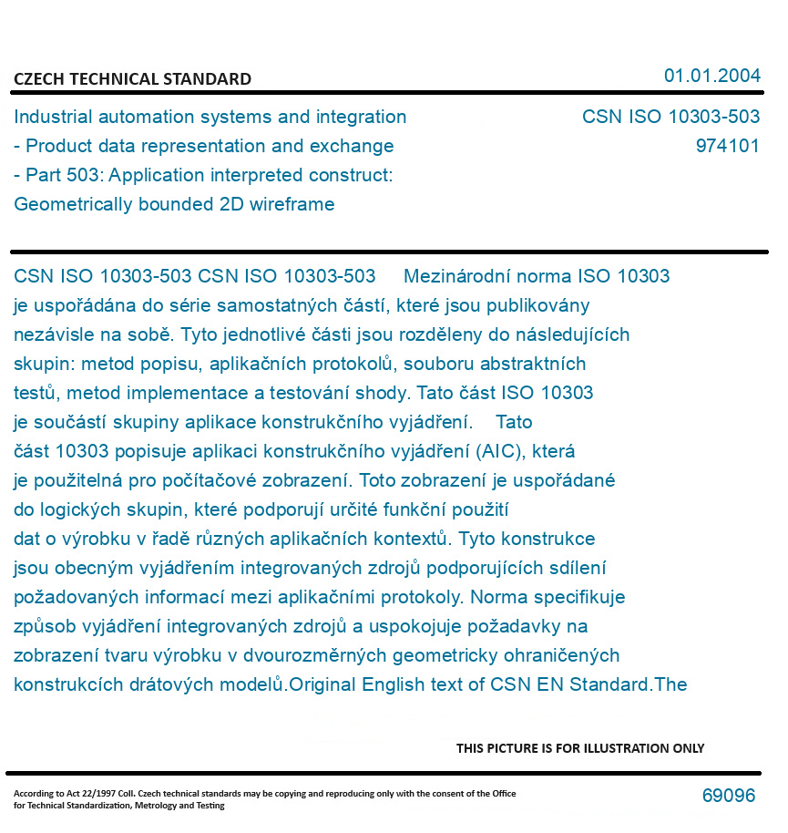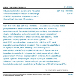 CSN ISO 10303-503 Mezinárodní norma ISO 10303 je uspořádána do série samostatných částí, které jsou publikovány nezávisle na sobě. Tyto jednotlivé části jsou rozděleny do následujících skupin: metod popisu, aplikačních protokolů, souboru abstraktních testů, metod implementace a testování shody. Tato část ISO 10303 je součástí skupiny aplikace konstrukčního vyjádření. Tato část 10303 popisuje aplikaci konstrukčního vyjádření (AIC), která je použitelná pro počítačové zobrazení. Toto zobrazení je uspořádané do logických skupin, které podporují určité funkční použití dat o výrobku v řadě různých aplikačních kontextů. Tyto konstrukce jsou obecným vyjádřením integrovaných zdrojů podporujících sdílení požadovaných informací mezi aplikačními protokoly. Norma specifikuje způsob vyjádření integrovaných zdrojů a uspokojuje požadavky na zobrazení tvaru výrobku v dvourozměrných geometricky ohraničených konstrukcích drátových modelů. Original English text of CSN EN Standard. The price of the Standard included all amendments and correcturs.