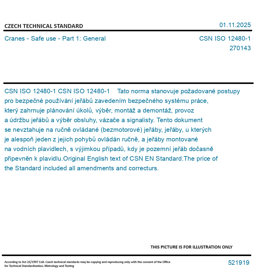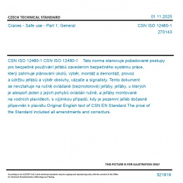 CSN ISO 12480-1 Tato norma stanovuje požadované postupy pro bezpečné používání jeřábů zavedením bezpečného systému práce, který zahrnuje plánování úkolů, výběr, montáž a demontáž, provoz a údržbu jeřábů a výběr obsluhy, vázače a signalisty. Tento dokument se nevztahuje na ručně ovládané (bezmotorové) jeřáby, jeřáby, u kterých je alespoň jeden z jejich pohybů ovládán ručně, a jeřáby montované na vodních plavidlech, s výjimkou případů, kdy je pozemní jeřáb dočasně připevněn k plavidlu. Original English text of CSN EN Standard. The price of the Standard included all amendments and correcturs.