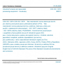 CSN ISO 13574 Tato mezinárodní norma stanovuje slovník pro všechny průmyslové pece a přidružená zařízení (PTZ). Tato mezinárodní norma poskytuje termíny a definice, které jsou určeny pro použití v následujících dokumentech: - ISO 13577 (všechny části), - ISO 13579 (všechny části). POZNÁMKA - Kromě termínů používaných v angličtině a francouzštině (dva ze tří oficiálních jazyků ISO) jsou v tomto dokumentu uvedeny ekvivalentní termíny v čínštině, němčině, japonštině, korejštině, polštině a španělštině; tyto termíny jsou publikovány v rámci odpovědnosti členských orgánů pro Čínu (SAC), Německo (DIN), Japonsko (JISC), Koreu (KATS), Polsko (PKN) a Španělsko (AENOR) a jsou uvedeny pouze pro informaci. Za termíny a definice ISO lze považovat pouze termíny a definice uvedené v oficiálních jazycích. Original English text of CSN EN Standard. The price of the Standard included all amendments and correcturs.