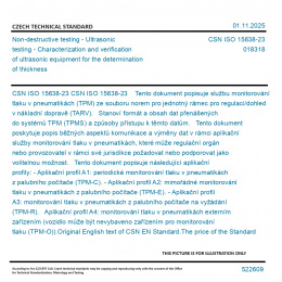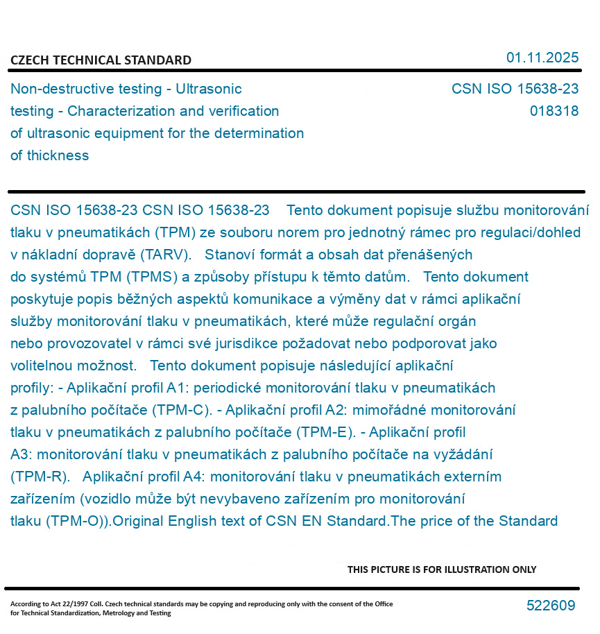 CSN ISO 15638-23 Tento dokument popisuje službu monitorování tlaku v pneumatikách (TPM) ze souboru norem pro jednotný rámec pro regulaci/dohled v nákladní dopravě (TARV). Stanoví formát a obsah dat přenášených do systémů TPM (TPMS) a způsoby přístupu k těmto datům. Tento dokument poskytuje popis běžných aspektů komunikace a výměny dat v rámci aplikační služby monitorování tlaku v pneumatikách, které může regulační orgán nebo provozovatel v rámci své jurisdikce požadovat nebo podporovat jako volitelnou možnost. Tento dokument popisuje následující aplikační profily: - Aplikační profil A1: periodické monitorování tlaku v pneumatikách z palubního počítače (TPM-C). - Aplikační profil A2: mimořádné monitorování tlaku v pneumatikách z palubního počítače (TPM-E). - Aplikační profil A3: monitorování tlaku v pneumatikách z palubního počítače na vyžádání (TPM-R). Aplikační profil A4: monitorování tlaku v pneumatikách externím zařízením (vozidlo může být nevybaveno zařízením pro monitorování tlaku (TPM-O)). Original English text of CSN EN Standard. The price of the Standard included all amendments and correcturs.