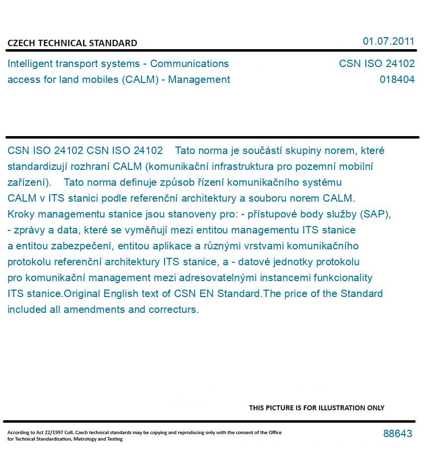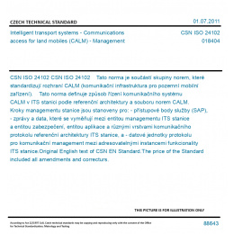 CSN ISO 24102 Tato norma je součástí skupiny norem, které standardizují rozhraní CALM (komunikační infrastruktura pro pozemní mobilní zařízení). Tato norma definuje způsob řízení komunikačního systému CALM v ITS stanici podle referenční architektury a souboru norem CALM. Kroky managementu stanice jsou stanoveny pro: - přístupové body služby (SAP), - zprávy a data, které se vyměňují mezi entitou managementu ITS stanice a entitou zabezpečení, entitou aplikace a různými vrstvami komunikačního protokolu referenční architektury ITS stanice, a - datové jednotky protokolu pro komunikační management mezi adresovatelnými instancemi funkcionality ITS stanice. Original English text of CSN EN Standard. The price of the Standard included all amendments and correcturs.