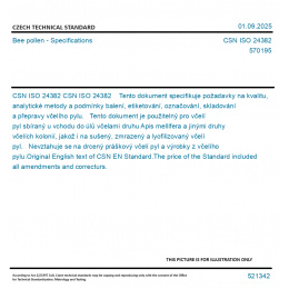 CSN ISO 24382 Tento dokument specifikuje požadavky na kvalitu, analytické metody a podmínky balení, etiketování, označování, skladování a přepravy včelího pylu. Tento dokument je použitelný pro včelí pyl sbíraný u vchodu do úlů včelami druhu Apis mellifera a jinými druhy včelích kolonií, jakož i na sušený, zmrazený a lyofilizovaný včelí pyl. Nevztahuje se na drcený práškový včelí pyl a výrobky z včelího pylu. Original English text of CSN EN Standard. The price of the Standard included all amendments and correcturs.