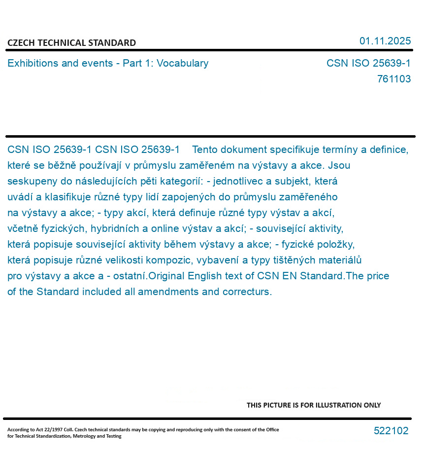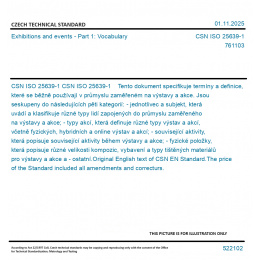 CSN ISO 25639-1 Tento dokument specifikuje termíny a definice, které se běžně používají v průmyslu zaměřeném na výstavy a akce. Jsou seskupeny do následujících pěti kategorií: - jednotlivec a subjekt, která uvádí a klasifikuje různé typy lidí zapojených do průmyslu zaměřeného na výstavy a akce; - typy akcí, která definuje různé typy výstav a akcí, včetně fyzických, hybridních a online výstav a akcí; - související aktivity, která popisuje související aktivity během výstavy a akce; - fyzické položky, která popisuje různé velikosti kompozic, vybavení a typy tištěných materiálů pro výstavy a akce a - ostatní. Original English text of CSN EN Standard. The price of the Standard included all amendments and correcturs.