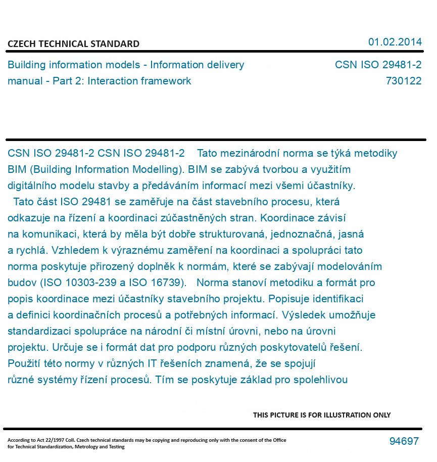 CSN ISO 29481-2 Tato mezinárodní norma se týká metodiky BIM (Building Information Modelling). BIM se zabývá tvorbou a využitím digitálního modelu stavby a předáváním informací mezi všemi účastníky. Tato část ISO 29481 se zaměřuje na část stavebního procesu, která odkazuje na řízení a koordinaci zúčastněných stran. Koordinace závisí na komunikaci, která by měla být dobře strukturovaná, jednoznačná, jasná a rychlá. Vzhledem k výraznému zaměření na koordinaci a spolupráci tato norma poskytuje přirozený doplněk k normám, které se zabývají modelováním budov (ISO 10303-239 a ISO 16739). Norma stanoví metodiku a formát pro popis koordinace mezi účastníky stavebního projektu. Popisuje identifikaci a definici koordinačních procesů a potřebných informací. Výsledek umožňuje standardizaci spolupráce na národní či místní úrovni, nebo na úrovni projektu. Určuje se i formát dat pro podporu různých poskytovatelů řešení. Použití této normy v různých IT řešeních znamená, že se spojují různé systémy řízení procesů. Tím se poskytuje základ pro spolehlivou výměnu a sdílení informací. Uživatelé si mohou být jisti, že informace, které jsou odesílány, nebo přijímány, jsou přesné a dostatečné pro prováděné koordinační činnosti. Original English text of CSN EN Standard. The price of the Standard included all amendments and correcturs.