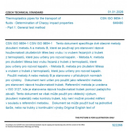 CSN ISO 9854-1 Tento dokument specifikuje dvě obecné metody zkoušení metodu A a metodu B, které se používají pro stanovení rázové houževnatosti zkušebních těles bez vrubu i s vrubem řezaných z trubek z termoplastů, které jsou určeny pro rozvod kapalin. - Metoda A: metoda pro zkušební tělesa bez vrubu řezaná z trubek z termoplastů, které jsou určeny pro rozvod kapalin. - Metoda B, metoda pro zkušební tělesa s vrubem z trubek z termoplastů, které jsou určeny pro rozvod kapalin. Použití metody A nebo metody B je stanoveno v příslušných normách pro výrobky. Dokument není určen pro použití jako referenční metoda pro stanovení rázové houževnatosti trubek. Referenční metoda je uvedena v ISO 3127, kde je stanovena rázová houževnatost trubek pomocí padajícího závaží. Tento dokument se však může použít pro vědecký výzkum, zkoušení materiálů nebo kontrolu trubek, kdy není možné provést měření v souladu s referenční metodou. Dokument se může použít buď na jednotlivé šarže, nebo na trubky z kontinuální výroby.