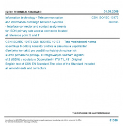 CSN ISO/IEC 10173 Tato mezinárodní norma specifikuje 8-pólový konektor (vidlice a zásuvka) a uspořádání čísel jeho kontaktů pro použití na fyzických rozhraních služeb primárního přístupu k Integrovaným službám digitální sítě (ISDN) v souladu s Doporučením ITU T L.431. Original English text of CSN EN Standard. The price of the Standard included all amendments and correcturs.