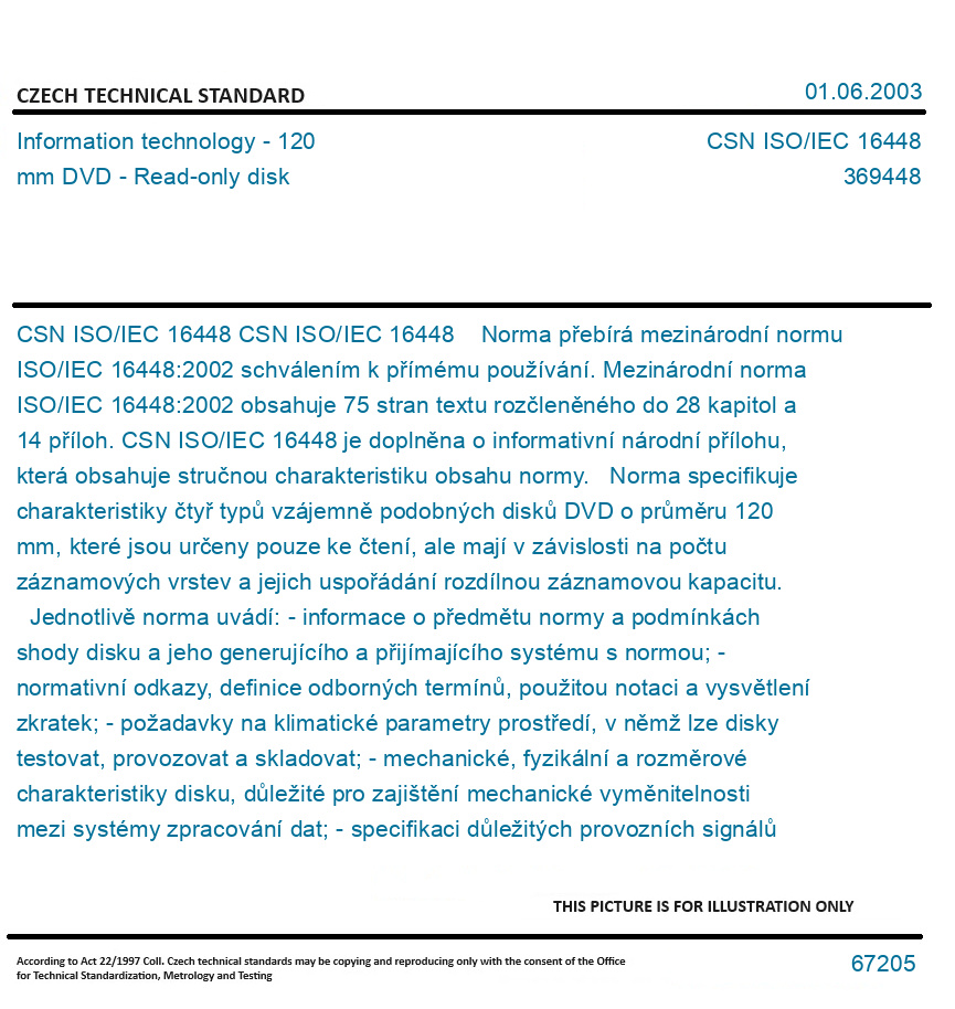 CSN ISO/IEC 16448 Norma přebírá mezinárodní normu ISO/IEC 16448:2002 schválením k přímému používání. Mezinárodní norma ISO/IEC 16448:2002 obsahuje 75 stran textu rozčleněného do 28 kapitol a 14 příloh. CSN ISO/IEC 16448 je doplněna o informativní národní přílohu, která obsahuje stručnou charakteristiku obsahu normy. Norma specifikuje charakteristiky čtyř typů vzájemně podobných disků DVD o průměru 120 mm, které jsou určeny pouze ke čtení, ale mají v závislosti na počtu záznamových vrstev a jejich uspořádání rozdílnou záznamovou kapacitu. Jednotlivě norma uvádí: - informace o předmětu normy a podmínkách shody disku a jeho generujícího a přijímajícího systému s normou; - normativní odkazy, definice odborných termínů, použitou notaci a vysvětlení zkratek; - požadavky na klimatické parametry prostředí, v němž lze disky testovat, provozovat a skladovat; - mechanické, fyzikální a rozměrové charakteristiky disku, důležité pro zajištění mechanické vyměnitelnosti mezi systémy zpracování dat; - specifikaci důležitých provozních signálů a jejich parametrů, které musí zajistit spolehlivé čtení zaznamenaných dat; - formát informací zaznamenaných na disku. U určitých fyzikálních parametrů norma popisuje i příslušné metody jejich měření.