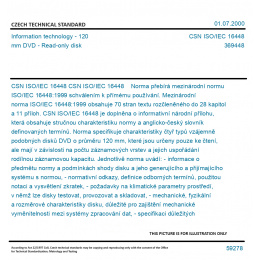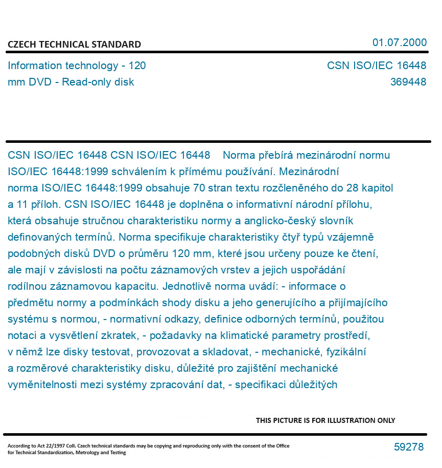 CSN ISO/IEC 16448 Norma přebírá mezinárodní normu ISO/IEC 16448:1999 schválením k přímému používání. Mezinárodní norma ISO/IEC 16448:1999 obsahuje 70 stran textu rozčleněného do 28 kapitol a 11 příloh. CSN ISO/IEC 16448 je doplněna o informativní národní přílohu, která obsahuje stručnou charakteristiku normy a anglicko-český slovník definovaných termínů. Norma specifikuje charakteristiky čtyř typů vzájemně podobných disků DVD o průměru 120 mm, které jsou určeny pouze ke čtení, ale mají v závislosti na počtu záznamových vrstev a jejich uspořádání rodílnou záznamovou kapacitu. Jednotlivě norma uvádí: - informace o předmětu normy a podmínkách shody disku a jeho generujícího a přijímajícího systému s normou, - normativní odkazy, definice odborných termínů, použitou notaci a vysvětlení zkratek, - požadavky na klimatické parametry prostředí, v němž lze disky testovat, provozovat a skladovat, - mechanické, fyzikální a rozměrové charakteristiky disku, důležité pro zajištění mechanické vyměnitelnosti mezi systémy zpracování dat, - specifikaci důležitých provozních signálů a jejich parametrů, které musí zajistit spolehlivé čtení zaznamenaných dat, - formát informací zaznamenaných na disku. U určitých fyzikálních parametrů norma popisuje metody jejich měření. Original English text of CSN EN Standard. The price of the Standard included all amendments and correcturs.