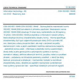 CSN ISO/IEC 16449 Norma přebírá mezinárodní normu ISO/IEC 16449:2002 schválením k přímému používání. Mezinárodní norma ISO/IEC 16449:2002 obsahuje 74 stran textu rozčleněného do 28 kapitol a 14 příloh. CSN ISO/IEC 16449 je doplněna o informativní národní přílohu, která obsahuje stručnou charakteristiku obsahu normy. Norma specifikuje charakteristiky čtyř typů vzájemně podobných disků DVD o průměru 80 mm, které jsou určeny pouze ke čtení, ale mají v závislosti na počtu záznamových vrstev a jejich uspořádání rozdílnou záznamovou kapacitu. Jednotlivě norma uvádí: - informace o předmětu normy a podmínkách shody disku a jeho generujícího a přijímajícího systému s normou; - normativní odkazy, definice odborných termínů, použitou notaci a vysvětlení zkratek; - požadavky na klimatické parametry prostředí, v němž lze disky testovat, provozovat a skladovat; - mechanické, fyzikální a rozměrové charakteristiky disku, důležité pro zajištění mechanické vyměnitelnosti mezi systémy zpracování dat; - specifikaci důležitých provozních signálů a jejich parametrů, které musí zajistit spolehlivé čtení zaznamenaných dat; - formát informací zaznamenaných na disku. U určitých fyzikálních parametrů norma popisuje i příslušné metody jejich měření.