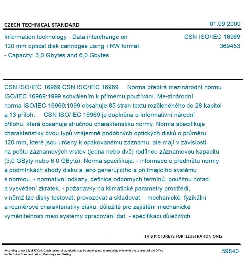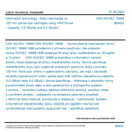 CSN ISO/IEC 16969 Norma přebírá mezinárodní normu ISO/IEC 16969:1999 schválením k přímému používání. Me-zinárodní norma ISO/IEC 16969:1999 obsahuje 85 stran textu rozčleněného do 28 kapitol a 13 příloh. CSN ISO/IEC 16969 je doplněna o informativní národní přílohu, která obsahuje stručnou charakteristiku normy. Norma specifikuje charakteristiky dvou typů vzájemně podobných optických disků o průměru 120 mm, které jsou určeny k opakovanému záznamu, ale mají v závislosti na počtu záznamových vrstev (jedna nebo dvě) rodílnou záznamovou kapacitu (3,0 GByty nebo 6,0 GBytů). Norma specifikuje: - informace o předmětu normy a podmínkách shody disku a jeho generujícího a přijímajícího systému s normou, - normativní odkazy, definice odborných termínů, použitou notaci a vysvětlení zkratek, - požadavky na klimatické parametry prostředí, v němž lze disky testovat, provozovat a skladovat, - mechanické, fyzikální a rozměrové charakteristiky disku, důležité pro zajištění mechanické vyměnitelnosti mezi systémy zpracování dat, - specifikaci důležitých provozních signálů a jejich parametrů, které musí zajistit spolehlivý zápis a čtení zaznamenaných dat, - formát informací zaznamenaných na disku, U důležitých parametrů norma popisuje metody jejich měření.