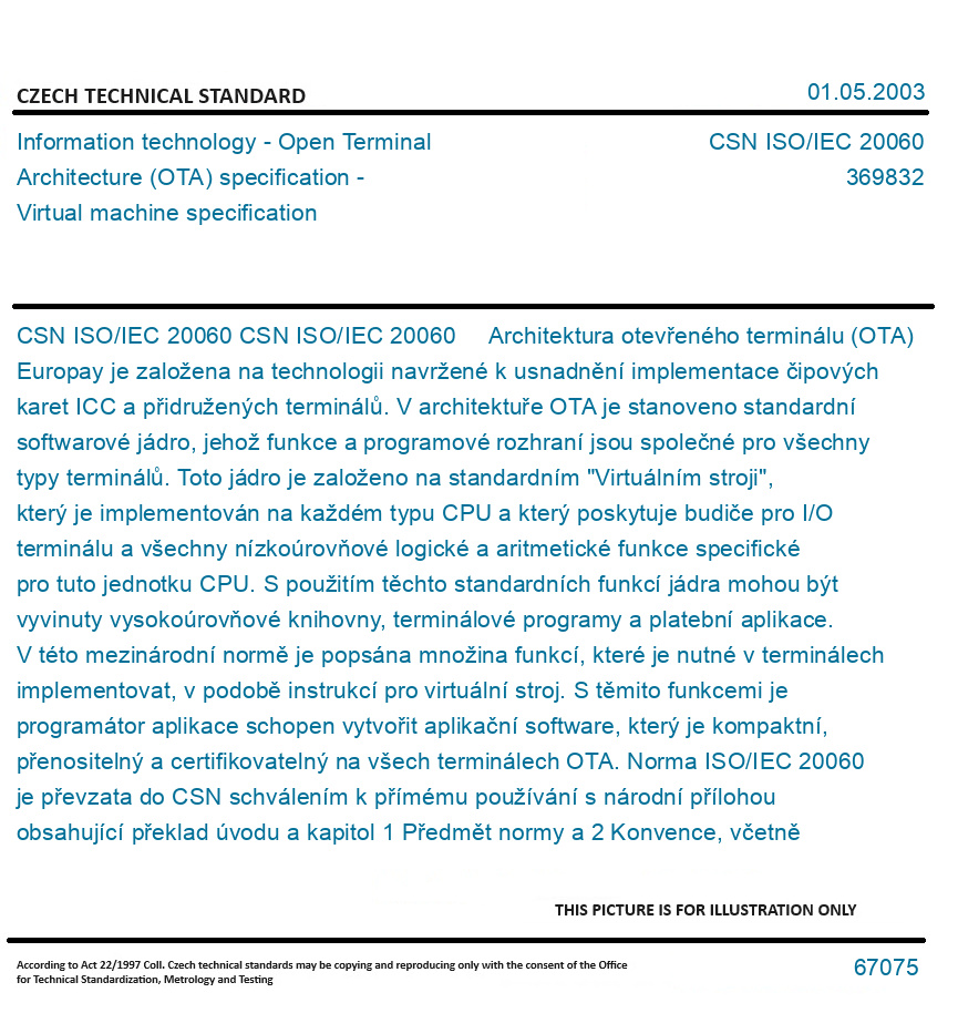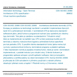 CSN ISO/IEC 20060 Architektura otevřeného terminálu (OTA) Europay je založena na technologii navržené k usnadnění implementace čipových karet ICC a přidružených terminálů. V architektuře OTA je stanoveno standardní softwarové jádro, jehož funkce a programové rozhraní jsou společné pro všechny typy terminálů. Toto jádro je založeno na standardním "Virtuálním stroji", který je implementován na každém typu CPU a který poskytuje budiče pro I/O terminálu a všechny nízkoúrovňové logické a aritmetické funkce specifické pro tuto jednotku CPU. S použitím těchto standardních funkcí jádra mohou být vyvinuty vysokoúrovňové knihovny, terminálové programy a platební aplikace. V této mezinárodní normě je popsána množina funkcí, které je nutné v terminálech implementovat, v podobě instrukcí pro virtuální stroj. S těmito funkcemi je programátor aplikace schopen vytvořit aplikační software, který je kompaktní, přenositelný a certifikovatelný na všech terminálech OTA. Norma ISO/IEC 20060 je převzata do CSN schválením k přímému používání s národní přílohou obsahující překlad úvodu a kapitol 1 Předmět normy a 2 Konvence, včetně článků 2.1 Zkratky, 2.2 Výkladový slovník a 2.3 Datové typy. Original English text of CSN EN Standard. The price of the Standard included all amendments and correcturs.
