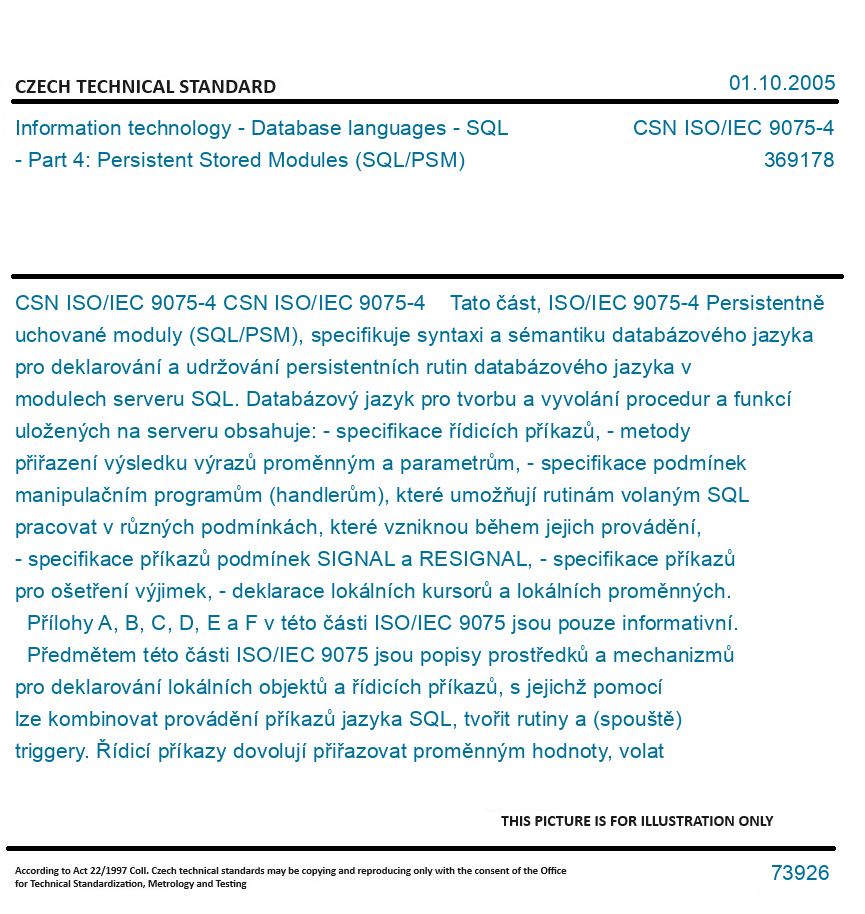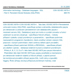 CSN ISO/IEC 9075-4 Tato část, ISO/IEC 9075-4 Persistentně uchované moduly (SQL/PSM), specifikuje syntaxi a sémantiku databázového jazyka pro deklarování a udržování persistentních rutin databázového jazyka v modulech serveru SQL. Databázový jazyk pro tvorbu a vyvolání procedur a funkcí uložených na serveru obsahuje: - specifikace řídicích příkazů, - metody přiřazení výsledku výrazů proměnným a parametrům, - specifikace podmínek manipulačním programům (handlerům), které umožňují rutinám volaným SQL pracovat v různých podmínkách, které vzniknou během jejich provádění, - specifikace příkazů podmínek SIGNAL a RESIGNAL, - specifikace příkazů pro ošetření výjimek, - deklarace lokálních kursorů a lokálních proměnných. Přílohy A, B, C, D, E a F v této části ISO/IEC 9075 jsou pouze informativní. Předmětem této části ISO/IEC 9075 jsou popisy prostředků a mechanizmů pro deklarování lokálních objektů a řídicích příkazů, s jejichž pomocí lze kombinovat provádění příkazů jazyka SQL, tvořit rutiny a (spouště) triggery. Řídicí příkazy dovolují přiřazovat proměnným hodnoty, volat rutiny, vyvolávat a ošetřovat výjimky a vytvářet strukturované programové konstrukce: - doplněním popisů identifikátorů objektů databázového jazyka SQL; - vymezením vlastností modulu SQL-serveru jako základního persistentního objektu definovaného ve schématu a identifikovaného jménem; - zpřesněním pojmů: rutina volaná SQL, cesta SQL, tabulka, schéma SQL, hostitelský parametr, diagnostická oblast, kursor, podmínka ošetření výjimky, příkaz jazyka SQL a základní model bezpečnosti; - zpřesněním specifikací lexikálních prvků, jmen a identifikátorů, skalárních výrazů, dotazovacích výrazů a dodatečných společných prvků; - specifikováním příkazů pro: definování schémat a manipulování s nimi, definování sloupců, domén, proměnných jazyka SQL, tabulek, pohledů, integritních omezení, modulů SQL-serveru, volání rutin SQL a manipulování s nimi, řízení přístupu, moduly klienta SQL, manipulaci s kursory a řádky tabulek, řízení výpočtu, dynamický SQL, vložený SQL, řízení diagnostiky, informační schéma, definiční schéma, stavové kódy a požadavky shody.
