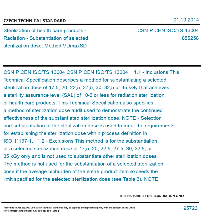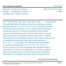 CSN P CEN ISO/TS 13004 1.1 - Inclusions This Technical Specification describes a method for substantiating a selected sterilization dose of 17,5, 20, 22,5, 27,5, 30, 32,5 or 35 kGy that achieves a sterility assurance level (SAL) of 10-6 or less for radiation sterilization of health care products. This Technical Specification also specifies a method of sterilization dose audit used to demonstrate the continued effectiveness of the substantiated sterilization dose. NOTE - Selection and substantiation of the sterilization dose is used to meet the requirements for establishing the sterilization dose within process definition in ISO 11137-1. 1.2 - Exclusions This method is for the substantiation of a selected sterilization dose of 17,5, 20, 22,5, 27,5, 30, 32,5, or 35 kGy only and is not used to substantiate other sterilization doses. The method is not used for the substantiation of a selected sterilization dose if the average bioburden of the entire product item exceeds the limit specified for the selected sterilization dose (see Table 3). NOTE - The methods for substantiation of selected sterilization doses of 25 kGy and 15 kGy are not included in this Technical Specification; they are described in ISO 11137-2. 1.3 - Application If the decision is made to use this method of sterilization dose establishment, the method is to be followed according to the requirements (shall) and guidance (should) stipulated herein. Original English text of CSN EN Standard. The price of the Standard included all amendments and correcturs.
