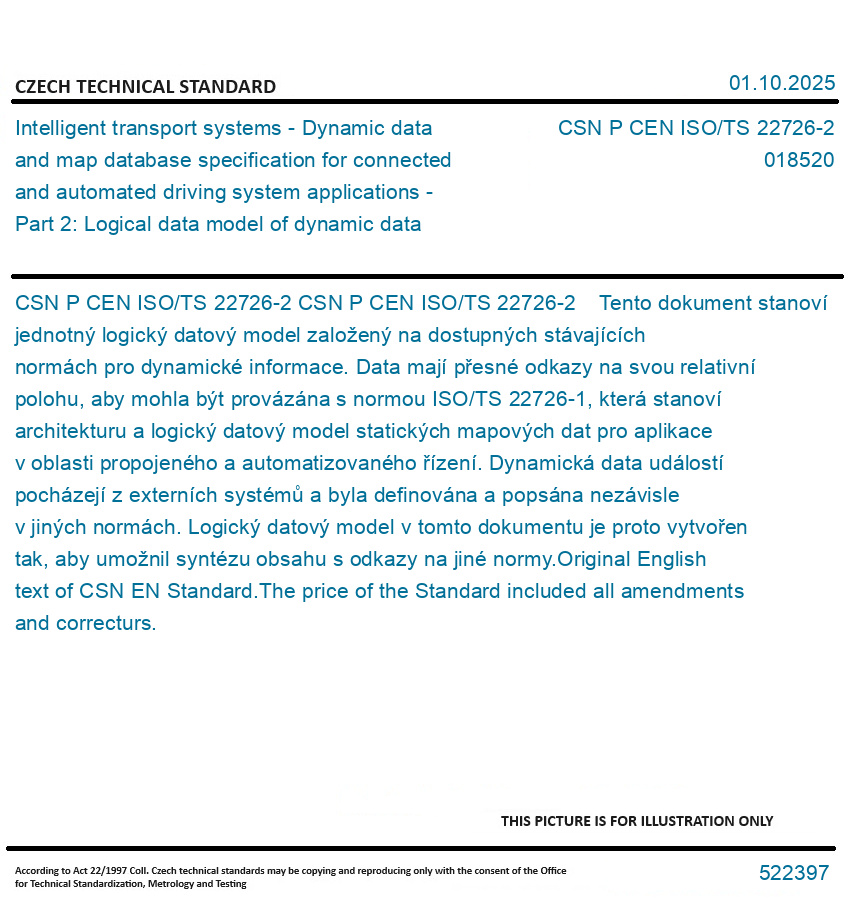 >CSN Standards>01 GENERAL CLASS>0185 Transport>CSN P CEN ISO/TS 22726-2 - Intelligent transport systems - Dynamic data and map database specification for connected and automated driving system applications - Part 2: Logical data model of dynamic data