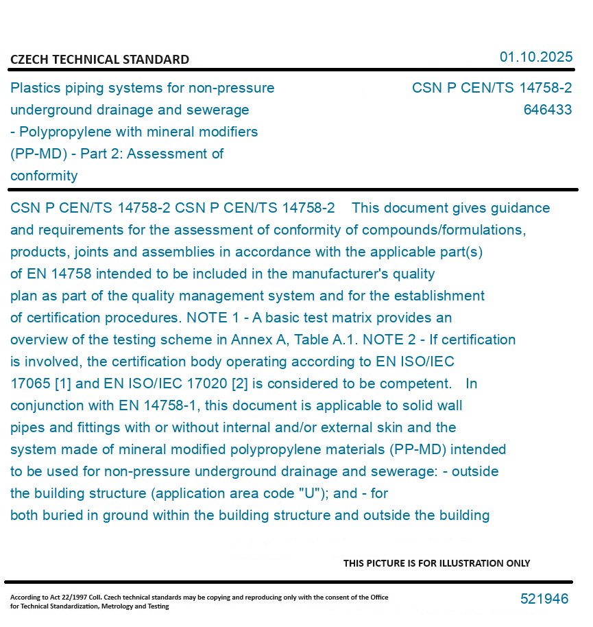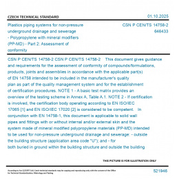 >CSN Standards>64 PLASTICS>6464 Plastic piping system>CSN P CEN/TS 14758-2 - Plastics piping systems for non-pressure underground drainage and sewerage - Polypropylene with mineral modifiers (PP-MD) - Part 2: Assessment of conformity
