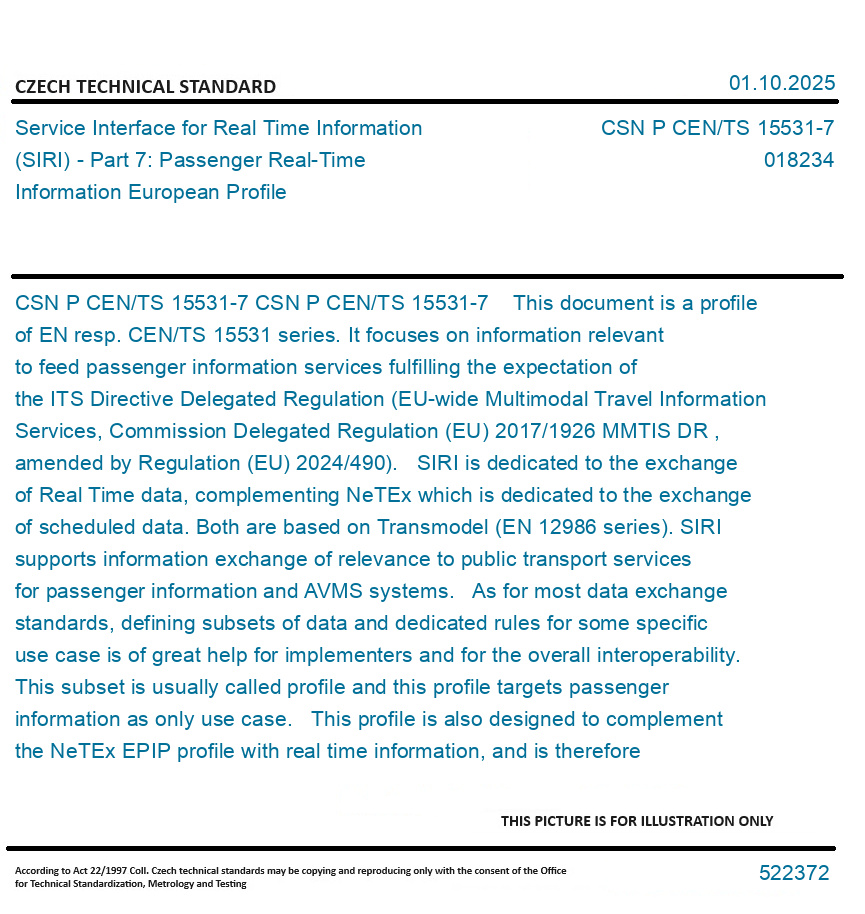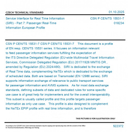 CSN P CEN/TS 15531-7 This document is a profile of EN resp. CEN/TS 15531 series. It focuses on information relevant to feed passenger information services fulfilling the expectation of the ITS Directive Delegated Regulation (EU-wide Multimodal Travel Information Services, Commission Delegated Regulation (EU) 2017/1926 MMTIS DR , amended by Regulation (EU) 2024/490). SIRI is dedicated to the exchange of Real Time data, complementing NeTEx which is dedicated to the exchange of scheduled data. Both are based on Transmodel (EN 12986 series). SIRI supports information exchange of relevance to public transport services for passenger information and AVMS systems. As for most data exchange standards, defining subsets of data and dedicated rules for some specific use case is of great help for implementers and for the overall interoperability. This subset is usually called profile and this profile targets passenger information as only use case. This profile is also designed to complement the NeTEx EPIP profile with real time information, and is therefore named EPIP-RT: both profiles are well articulated and can be uses seamlessly (at national level in NAPs -National Access Points- or at any local level where both scheduled and real time information are consistently provided). Original English text of CSN EN Standard. The price of the Standard included all amendments and correcturs.