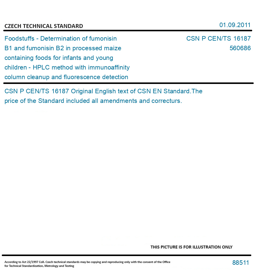 >CSN Standards>56 FOOD INDUSTRY PRODUCTS>5606 Mill products>CSN P CEN/TS 16187 - Foodstuffs - Determination of fumonisin B1 and fumonisin B2 in processed maize containing foods for infants and young children - HPLC method with immunoaffinity column cleanup and fluorescence detection after precolumn derivatization