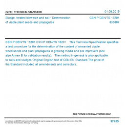 CSN P CEN/TS 16201 This Technical Specification specifies a test procedure for the determination of the content of unwanted viable weed seeds and plant propagules in growing media and soil improvers (see also Annex B for validation results). The method in general is also applicable to soils and sludges. Original English text of CSN EN Standard. The price of the Standard included all amendments and correcturs.