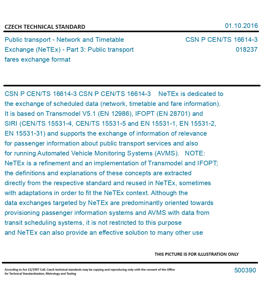CSN P CEN/TS 16614-3 NeTEx is dedicated to the exchange of scheduled data (network, timetable and fare information). It is based on Transmodel V5.1 (EN 12986), IFOPT (EN 28701) and SIRI (CEN/TS 15531-4, CEN/TS 15531-5 and EN 15531-1, EN 15531-2, EN 15531-31) and supports the exchange of information of relevance for passenger information about public transport services and also for running Automated Vehicle Monitoring Systems (AVMS). NOTE: NeTEx is a refinement and an implementation of Transmodel and IFOPT; the definitions and explanations of these concepts are extracted directly from the respective standard and reused in NeTEx, sometimes with adaptations in order to fit the NeTEx context. Although the data exchanges targeted by NeTEx are predominantly oriented towards provisioning passenger information systems and AVMS with data from transit scheduling systems, it is not restricted to this purpose and NeTEx can also provide an effective solution to many other use cases for transport data exchange. Original English text of CSN EN Standard. The price of the Standard included all amendments and correcturs.