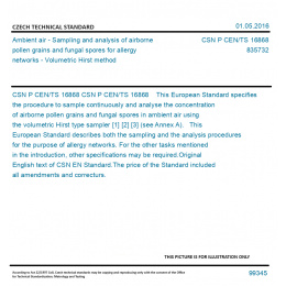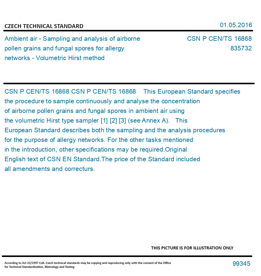 CSN P CEN/TS 16868 This European Standard specifies the procedure to sample continuously and analyse the concentration of airborne pollen grains and fungal spores in ambient air using the volumetric Hirst type sampler [1] [2] [3] (see Annex A). This European Standard describes both the sampling and the analysis procedures for the purpose of allergy networks. For the other tasks mentioned in the introduction, other specifications may be required. Original English text of CSN EN Standard. The price of the Standard included all amendments and correcturs.