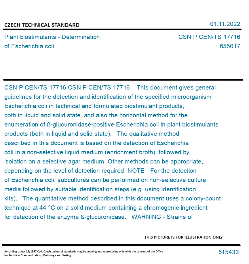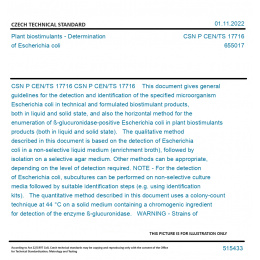 CSN P CEN/TS 17716 This document gives general guidelines for the detection and identification of the specified microorganism Escherichia coli in technical and formulated biostimulant products, both in liquid and solid state, and also the horizontal method for the enumeration of ß-glucuronidase-positive Escherichia coli in plant biostimulants products (both in liquid and solid state). The qualitative method described in this document is based on the detection of Escherichia coli in a non-selective liquid medium (enrichment broth), followed by isolation on a selective agar medium. Other methods can be appropriate, depending on the level of detection required. NOTE - For the detection of Escherichia coli, subcultures can be performed on non-selective culture media followed by suitable identification steps (e.g. using identification kits). The quantitative method described in this document uses a colony-count technique at 44 °C on a solid medium containing a chromogenic ingredient for detection of the enzyme ß-glucuronidase. WARNING - Strains of Escherichia coli which do not grow at 44 °C and, in particular, those that are ß-glucuronidase negative, such as Escherichia coli O157, will not be detected. Original English text of CSN EN Standard. The price of the Standard included all amendments and correcturs.