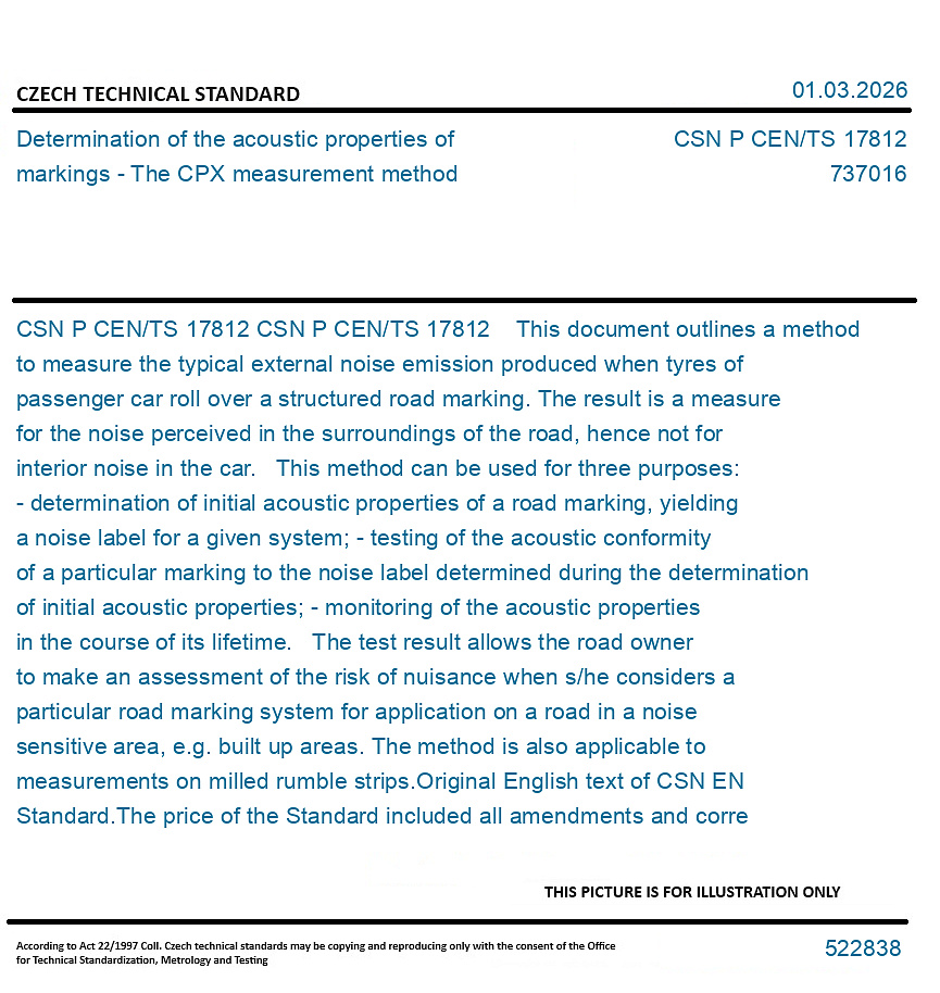 CSN P CEN/TS 17812 This document outlines a method to measure the typical external noise emission produced when tyres of passenger car roll over a structured road marking. The result is a measure for the noise perceived in the surroundings of the road, hence not for interior noise in the car. This method can be used for three purposes: - determination of initial acoustic properties of a road marking, yielding a noise label for a given system; - testing of the acoustic conformity of a particular marking to the noise label determined during the determination of initial acoustic properties; - monitoring of the acoustic properties in the course of its lifetime. The test result allows the road owner to make an assessment of the risk of nuisance when s/he considers a particular road marking system for application on a road in a noise sensitive area, e.g. built up areas. The method is also applicable to measurements on milled rumble strips.