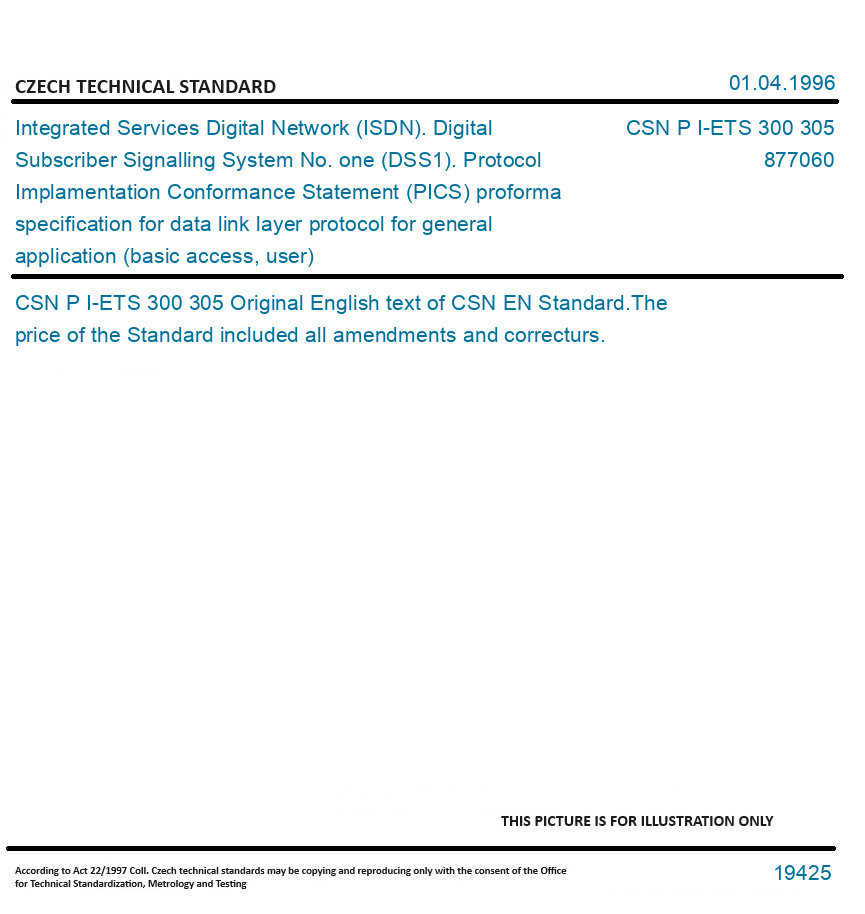 >CSN Standards>87 TELECOMMUNICATIONS>8770 Signalling protocols and connection>CSN P I-ETS 300 305 - Integrated Services Digital Network (ISDN). Digital Subscriber Signalling System No. one (DSS1). Protocol Implamentation Conformance Statement (PICS) proforma specification for data link layer protocol for general application (basic access, user)