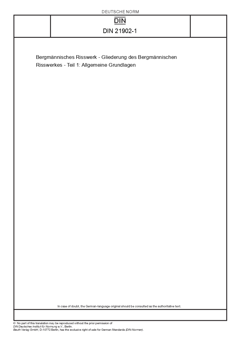 DIN 21902-1 Bergmännisches Risswerk - Gliederung des Bergmännischen Risswerkes - Teil 1: Allgemeine Grundlagenin stockReleased: 2025-10