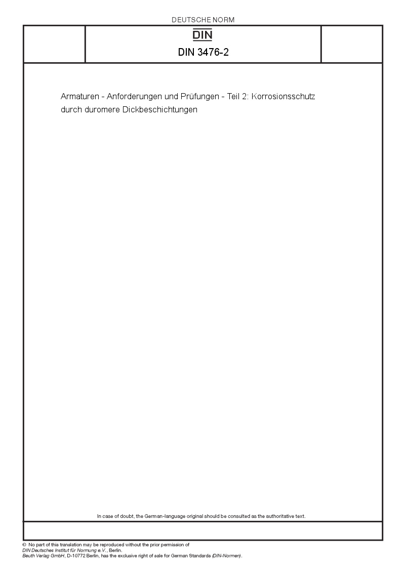 DIN 3476-2 Armaturen - Anforderungen und Prüfungen - Teil 2: Korrosionsschutz durch duromere Dickbeschichtungenin stockReleased: 2018-08