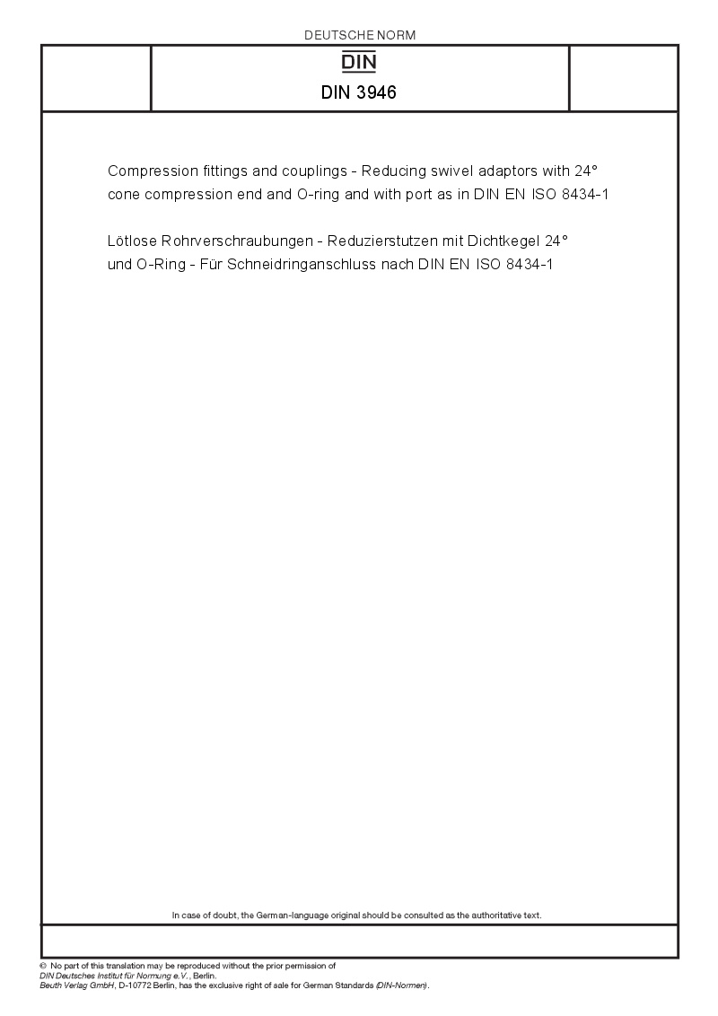 >DIN Standards>DIN 3946 Compression fittings and couplings - Reducing swivel adaptors with 24° cone compression end and O-ring and with port as in DIN EN ISO 8434-1