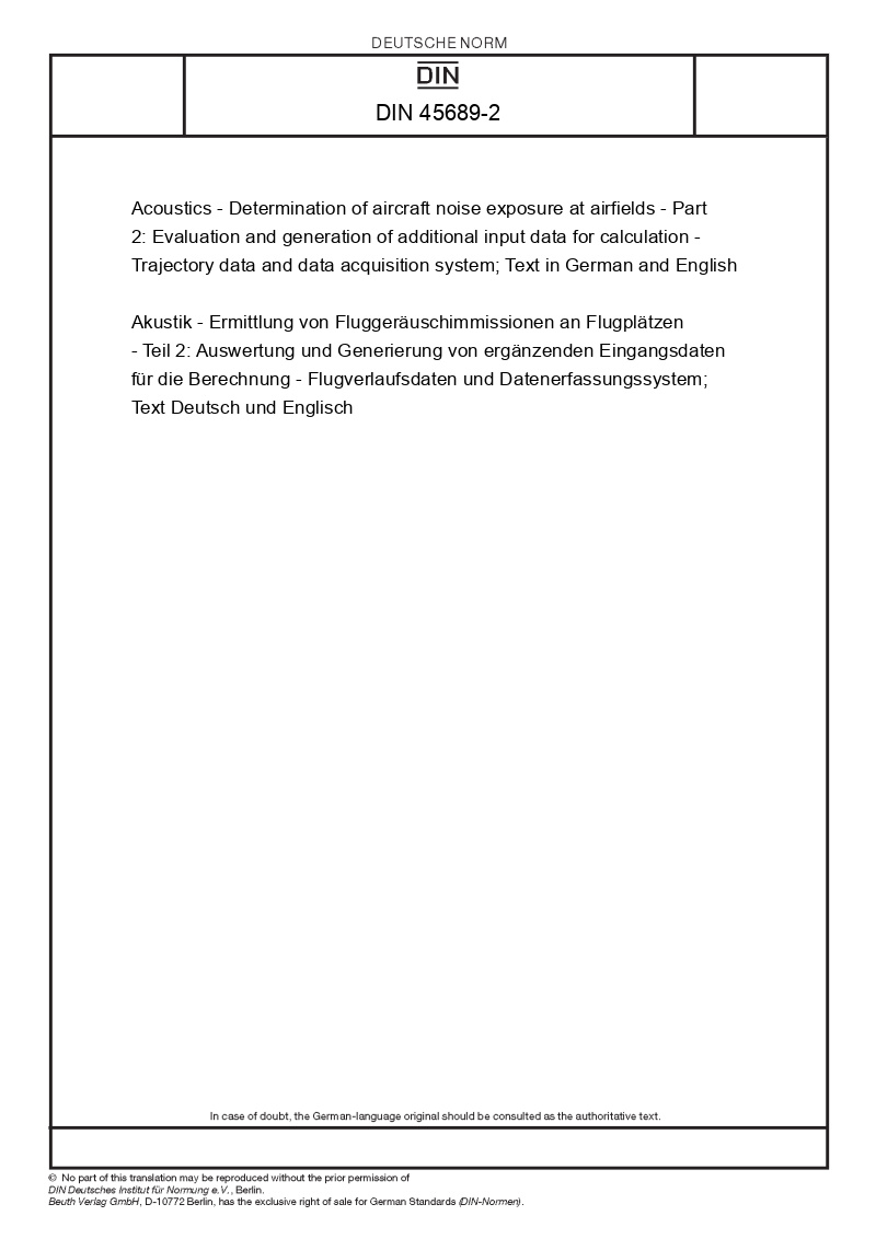 | Name: | Acoustics - Determination of aircraft noise exposure at airfields - Part 2: Evaluation and generation of additional input data for calculation - Trajectory data and data acquisition system; Text in German and English |