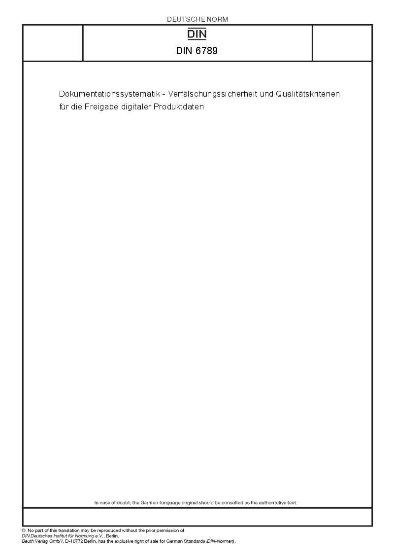 DIN 6789 Dokumentationssystematik - Verfälschungssicherheit und Qualitätskriterien für die Freigabe digitaler Produktdatenin stockReleased: 2013-10