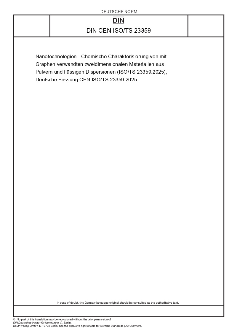 Nanotechnologien - Chemische Charakterisierung von mit Graphen verwandten zweidimensionalen Materialien aus Pulvern und flüssigen Dispersionen (ISO/TS 23359:2025); Deutsche Fassung CEN ISO/TS 23359:2025