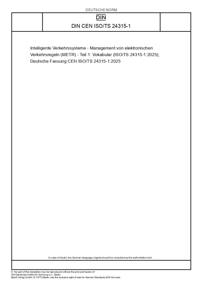 Intelligente Verkehrssysteme - Management von elektronischen Verkehrsregeln (METR) - Teil 1: Vokabular (ISO/TS 24315-1:2025); Deutsche Fassung CEN ISO/TS 24315-1:2025