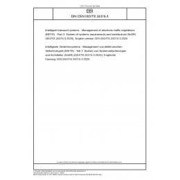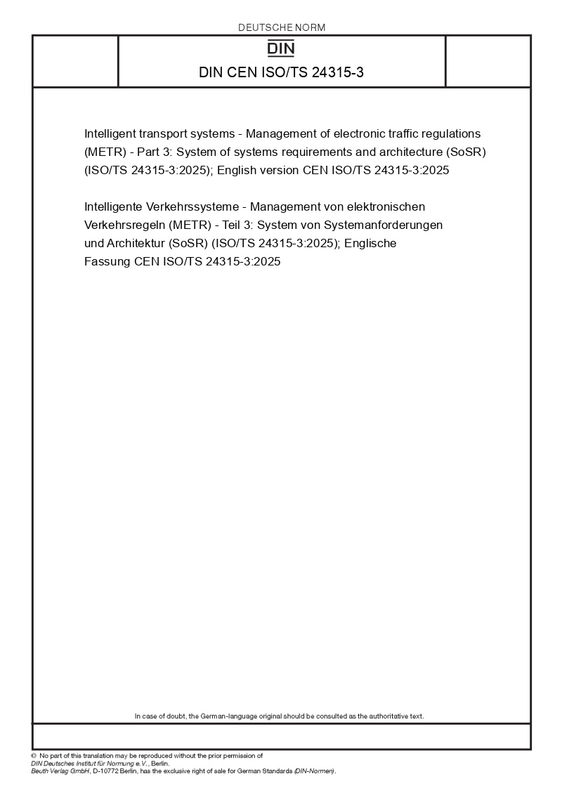 | Name: | Intelligent transport systems - Management of electronic traffic regulations (METR) - Part 3: System of systems requirements and architecture (SoSR) (ISO/TS 24315-3:2025); English version CEN ISO/TS 24315-3:2025 |
