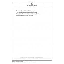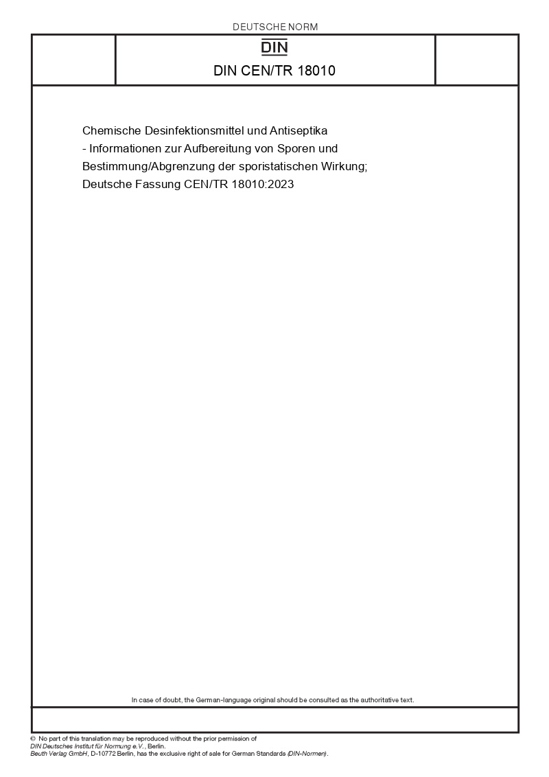 >DIN Standards>DIN CEN/TR 18010 Chemische Desinfektionsmittel und Antiseptika - Informationen zur Aufbereitung von Sporen und Bestimmung/Abgrenzung der sporistatischen Wirkung; Deutsche Fassung CEN/TR 18010:2023
