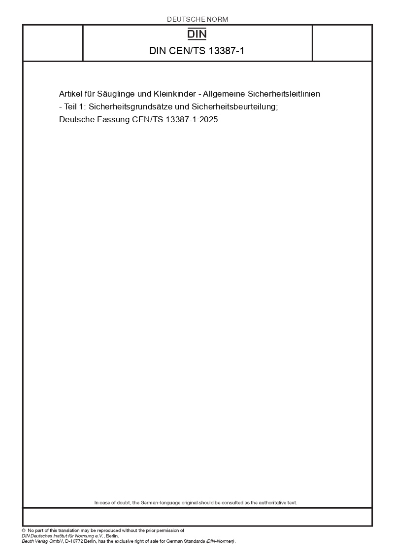 | Name: | Artikel für Säuglinge und Kleinkinder - Allgemeine Sicherheitsleitlinien - Teil 1: Sicherheitsgrundsätze und Sicherheitsbeurteilung; Deutsche Fassung CEN/TS 13387-1:2025 |
