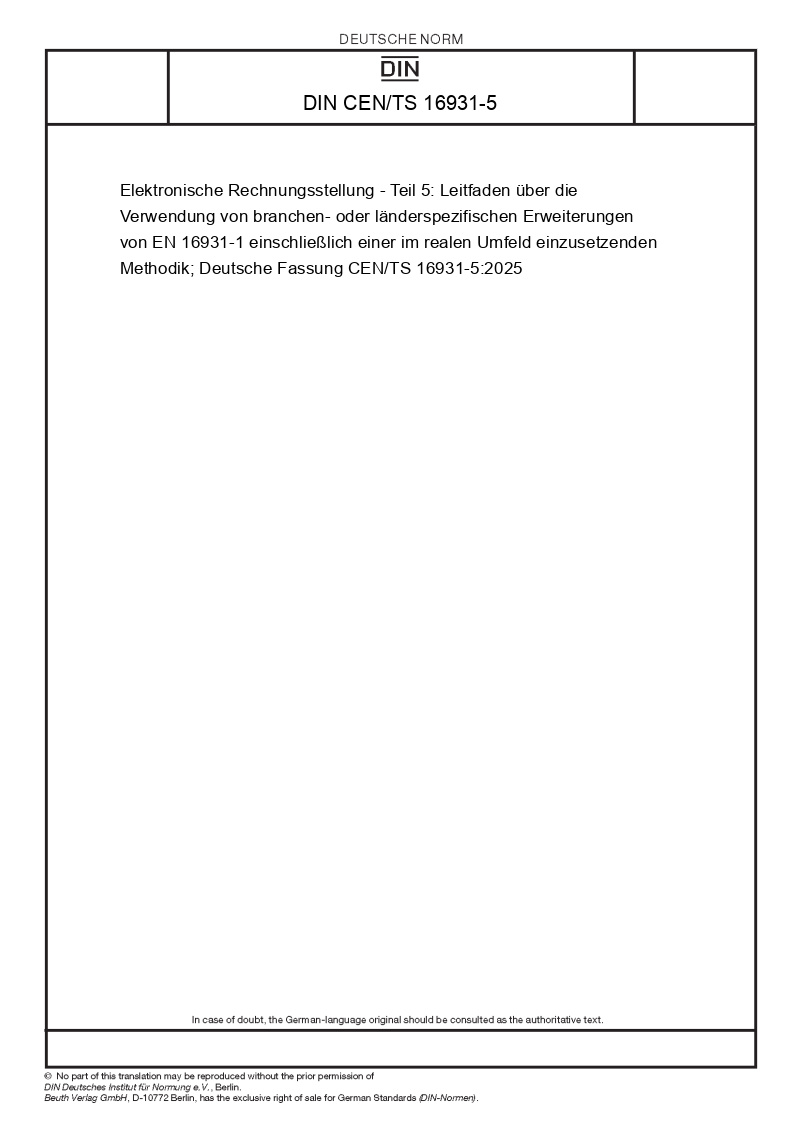 | Name: | Elektronische Rechnungsstellung - Teil 5: Leitfaden über die Verwendung von branchen- oder länderspezifischen Erweiterungen von EN 16931-1 einschließlich einer im realen Umfeld einzusetzenden Methodik; Deutsche Fassung CEN/TS 16931-5:2025 |